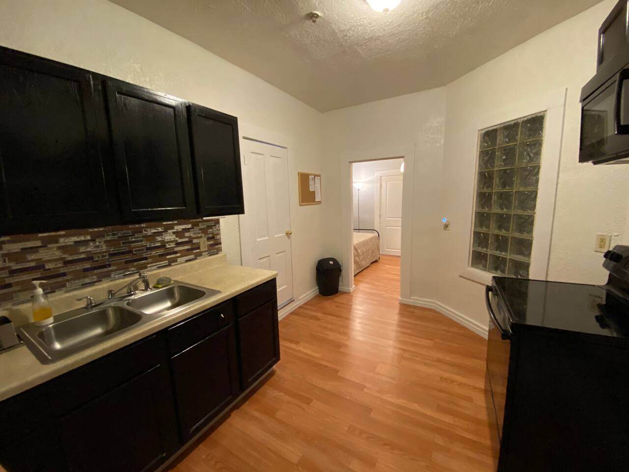 This listing is for recently renovated Apartment 7 inside the Union Plaza Apartment Complex. Follow us on FB and IG @stayunionplaza to see more of Union plaza and El Centro districts. The building was built nearly 100 years ago. The unit is located on the second floor of the building which will require climbing stairs, there is no ramp for luggage. The studio is about 450 square feet and it comfortable accommodates 2 guest. ** NOTE: All units are located on the 2nd floor of the building, stairs are not optional, the 1st floor are all commercial spaces. ** The kitchen space was designed with a modern contemporary style in mind, ergo the open shelving space. It is fully equipped for cooking, it features an electric stove, a double sink with a garbage disposal, an over-the-range microwave, pots and pans, dishes and utensils and solid surface countertops. The bathroom includes a full shower with handheld shower head and great water pressure, as well as a new vanity and a skylight. In the living area, there’s a small Ikea foldable table with 2 chairs. Above the day bed you will find the Mini Split AC/Heater with control remote. There are two doors separating the living area with the bedroom. The bedroom features a Queen Bed, alternative pillows, 100% cotton linens, a closet w/ hangers and drawers and a view through the window towards the baseball stadium, which occasionally on game nights has a firework show. Please make sure to review house rules prior to booking!