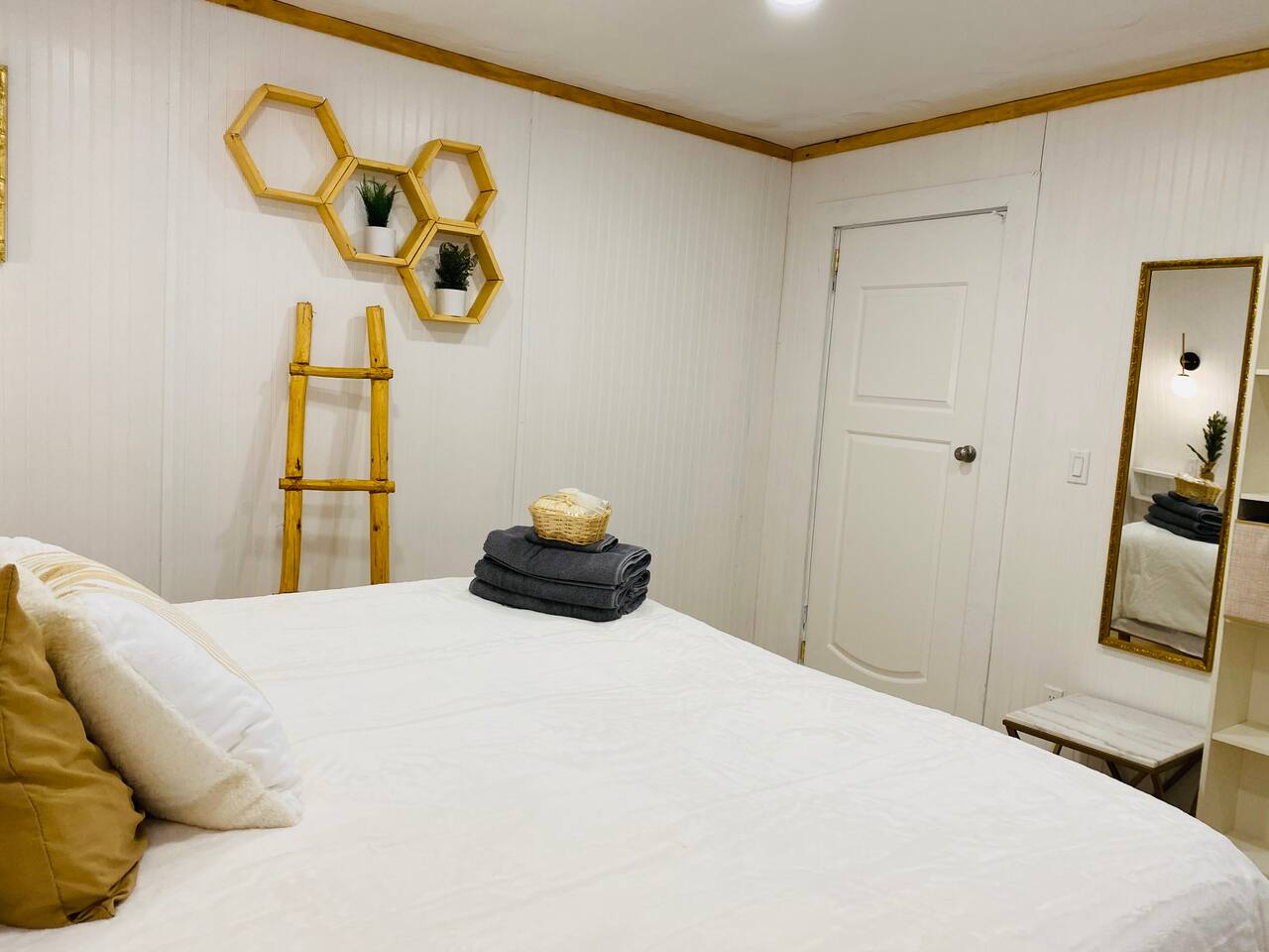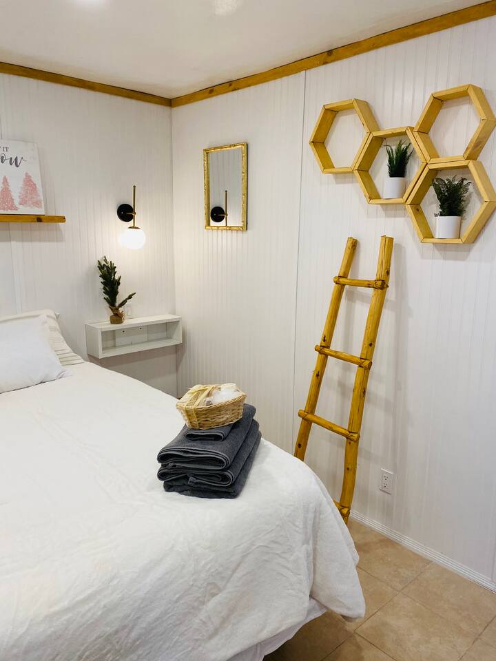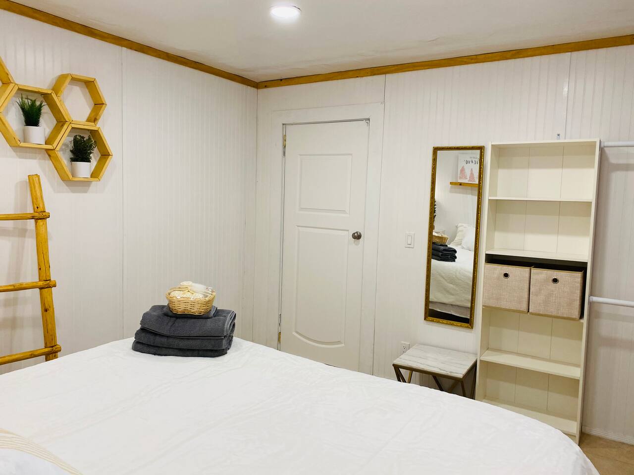 Brand new modern escape in Central El Paso. Professionally designed and remodeled Duplex with a light, airy aesthetic, and natural textures throughout. This listing is for one half of a remodeled two-unit duplex. This unit is about 800 square feet. It includes a newly remodeled kitchen, living and dining room, 1 bedroom and 1 bathroom. As you enter the space you will be welcomed by a modern farmhouse design of living room plus dining table. The lighting is excellent all around. We have design the space to where you can easily relax and unwind. In the living room has a flat 40” screen smart TV where you can access Netflix, Hulu, and other TV apps. There is no antenna or cable! The design is completed with a sleek white and gold couch, rusty coffee table and side table. The newly remodeled farmhouse kitchen is complete with pots, pans, dishes, silverware, coffee maker, oven gas range, over the range microwave and double door fridge. While there is no complimentary breakfast, we always make sure there is coffee and tea stocked for your convenience at our coffee bar. The dining room is open to the living room and has seating space for 4. A square white dining table with black tall dining chairs. The bedroom boasts a Queen size bed with a brand new mattress and plenty of pillows to customize your comfort. This room is a modern Boho style with abstract art and honeycomb shelves. There’s a bathroom with an oversized walk-in rainfall shower, plus fully stocked vanity toiletries. This apartment is complete with an easy to control Mini splits both on the living area and bedroom, smart TV, and plush furnishings. You will have direct access to the laundry room. Please remember that the laundry room is a shared space and you must not leave your belongings unattended plus always be fully dressed when in shared spaces. That includes wearing a t-shirt at all times. We have a big backyard/patio that we are still working on. This space will be shared between the units and at the moment with the hosts.