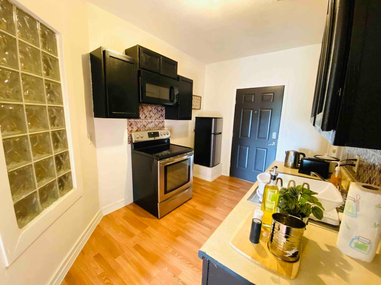 This listing is for recently renovated Apartment 12 inside the Union Plaza Apartments Private Complex. Follow us on FB and IG @stayunionplaza to see more of Union plaza and El Centro districts. The building was built nearly 100 years ago. The unit is located on the second floor of the building which will require climbing stairs, there is no ramp for luggage. The one bedroom apartment is about 450 square feet and it accommodates 2 guests comfortably and can sleep 4 if needed. ** NOTE: All units are located on the 2nd floor of the building, stairs are not optional, the 1st floor are all commercial spaces. Need code to enter building*** The kitchen space was designed with a modern contemporary style in mind, ergo the open shelving space. It is fully equipped for cooking, it features an electric stove with oven, a double sink with a garbage disposal, a wood countertop with two bar stools an over-the-range microwave, pots and pans, dishes and utensils and solid surface countertops. The bathroom includes a full shower with handheld shower head and great water pressure, as well as a new vanity and a skylight. In the living area, there’s a daybed for guest #3 and #4 and a small Roku TV. There are two barn doors separating the living area with the bedroom. The bedroom features a King Memory foam Bed, alternative pillows, 100% cotton linens, a closet w/ hangers and drawers and next to the window you will find the Mini Split AC/Heater with control remote. Please make sure to review house rules prior to booking!