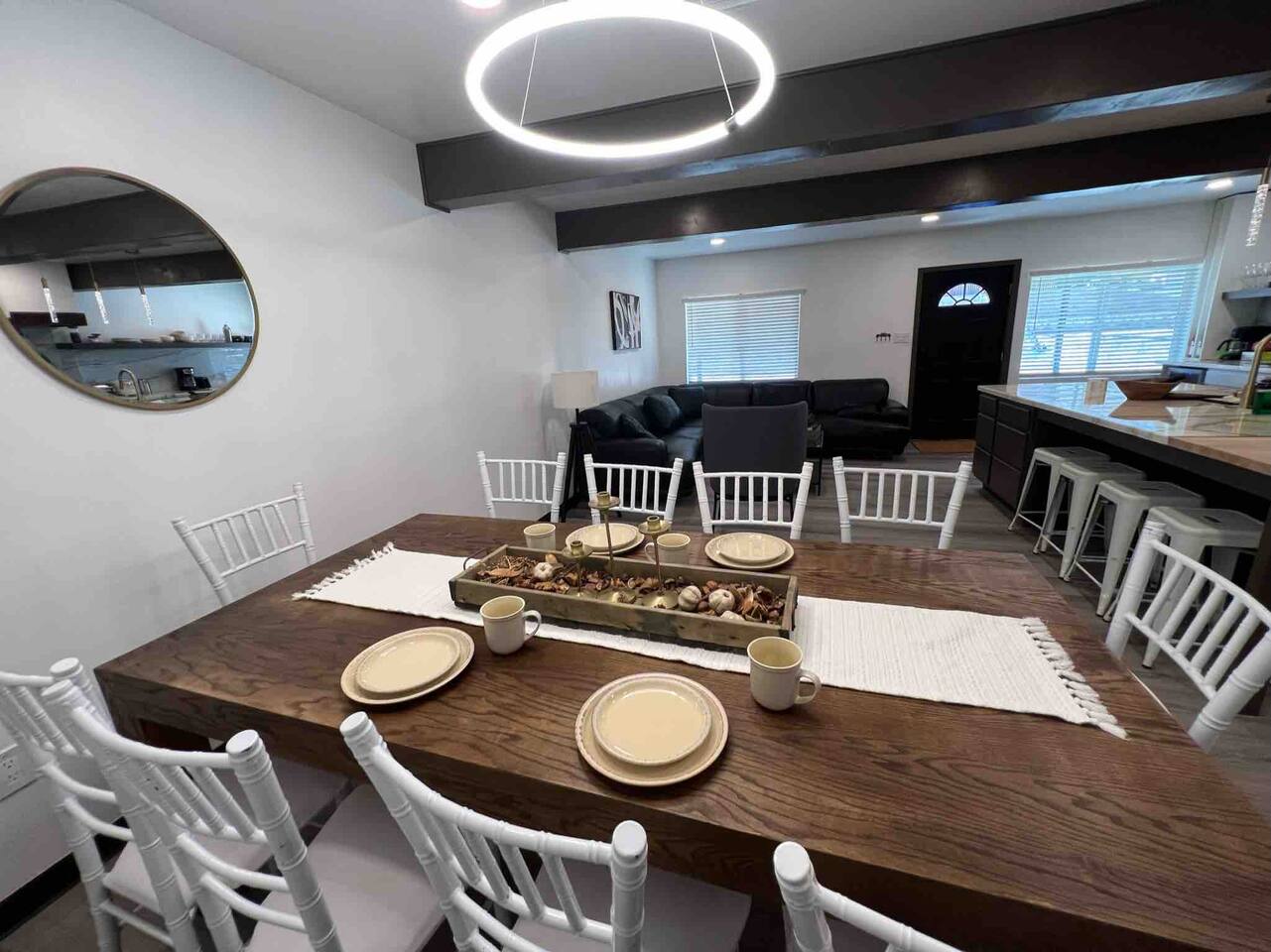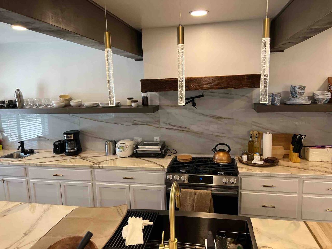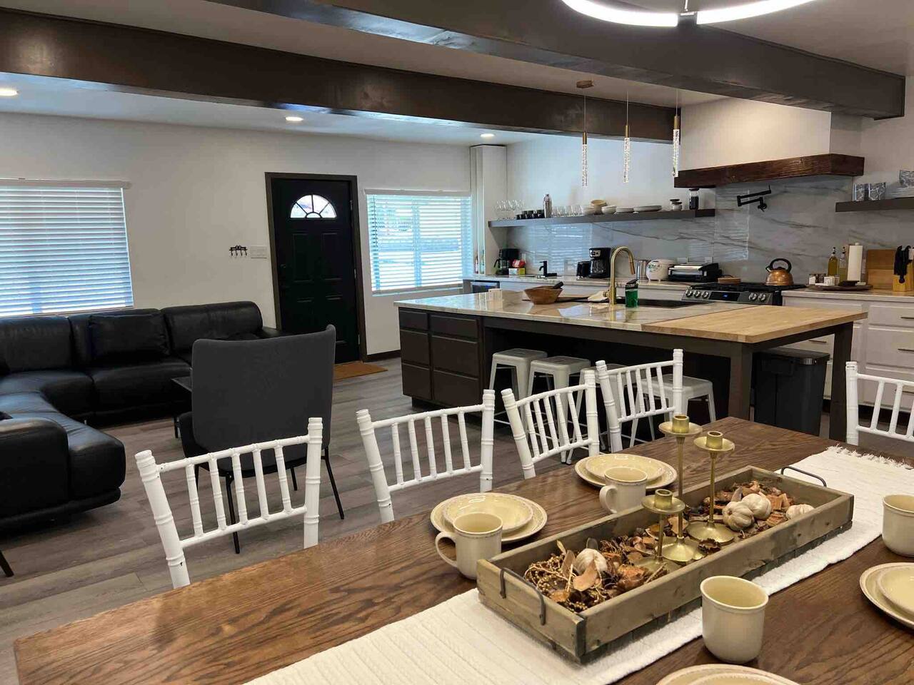 As you enter the home with the self check in code you’ll be welcomed by an open concept kitchen and living room. Our 10ft island welcomes you to a Rustic Luxury experience. The living room and dining table are all part of the open concept. The dining table seats up to 10 people, a piece that was handmade by my husband. The kitchen is equipped with everything you might need, pots and pans to cook plus stainless steel appliance throughout including a dishwasher, double oven, microwave, pot filler, full range and long Island. There’s a total of 2 bedrooms in the home, there’s also 2 full bathrooms total all with great showers and water pressure. The master suite features a king size bed, both down & down alternative pillows, beautiful modern decor. Theres a smart TV available for use, a “Might have Forgotten” basket for our guests. There another kind size bedroom and one bedroom has a bunk bed with a queen bed underneath and 2 single beds up top with down & down alternative pillows and rustic decor. There’s a hallway bathroom with a shower with great water pressure and a double vanity. Please feel free to use any of the toiletries we left behind for our guests. AC and heating is controlled by one central thermostat for the entire home. If you need an extra heater or fan, please let me know.